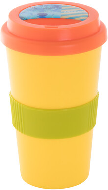 Dvoustěnný plastový termo hrnek s víčkem na pití a silikonovým úchopem na zakázku. 400 ml. Min. mn.: 50 ks.