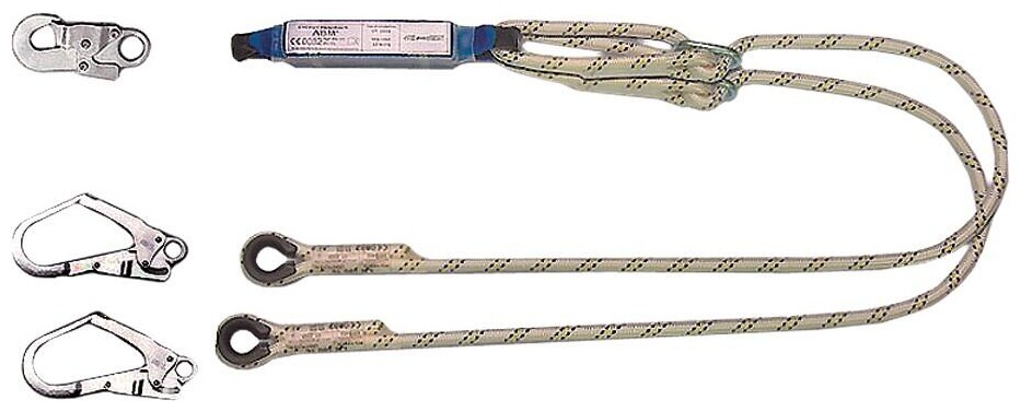 Tlumič pádu s dvěma lany a třemi karabinami. Konstrukce: tlumič pádu, polyamidové lano LB 100 o průměru 12mm, 1x karabina AZ 002 - ocelová karabina s otvorem 18 mm, 2x karabina AZ 022 - ocelová karabina s otvorem 50 mm.