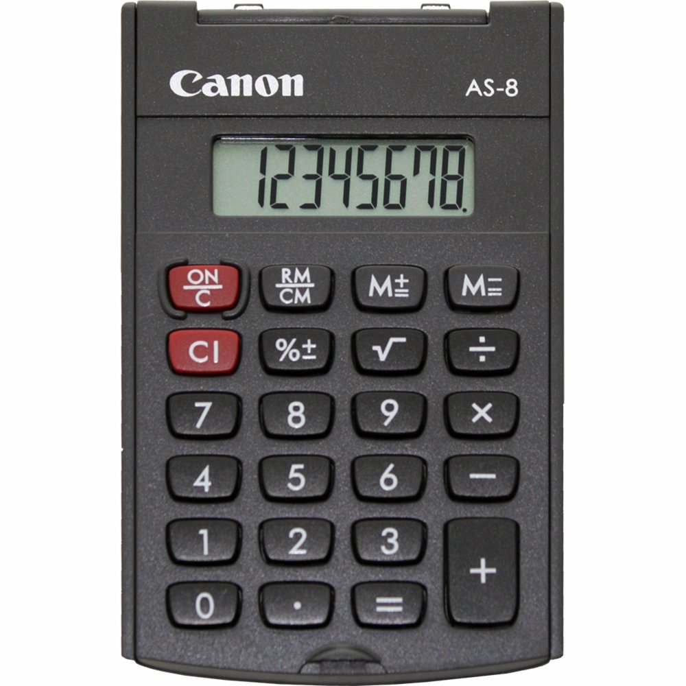 Tato kompaktní a stylová kapesní kalkulačka Canon AS-8 s 8místným displejem se vyznačuje elegantním obloukovým tvarem a odolným krytem, který lze odklopit o 360 stupňů směrem nahoru, díky tomu je tento model ideální pro použití v kanceláři nebo pro osoby, které jsou neustále v pohybu. Dalšími výhodami které skýtá tato kalkulačka jsou kompaktní a lehké provedení, výroba z recyklovaného materiálu společnosti Canon, velký LCD displej s klávesnicí.