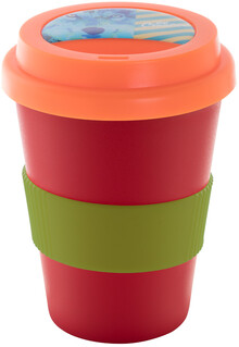 Dvoustěnný plastový termo hrnek s víčkem na pití a silikonovým úchopem na zakázku. 300 ml. Min. mn.: 50 ks.
