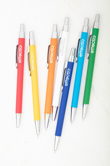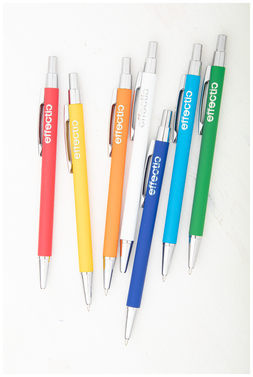 Hliníkové kuličkové pero s pogumovanou úpravou a modrou náplní. Speciální povrch pro zrcadlový laser.