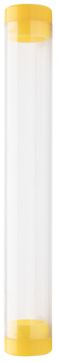 Průhledná plastová tuba na pera s barevnými uzávěry.