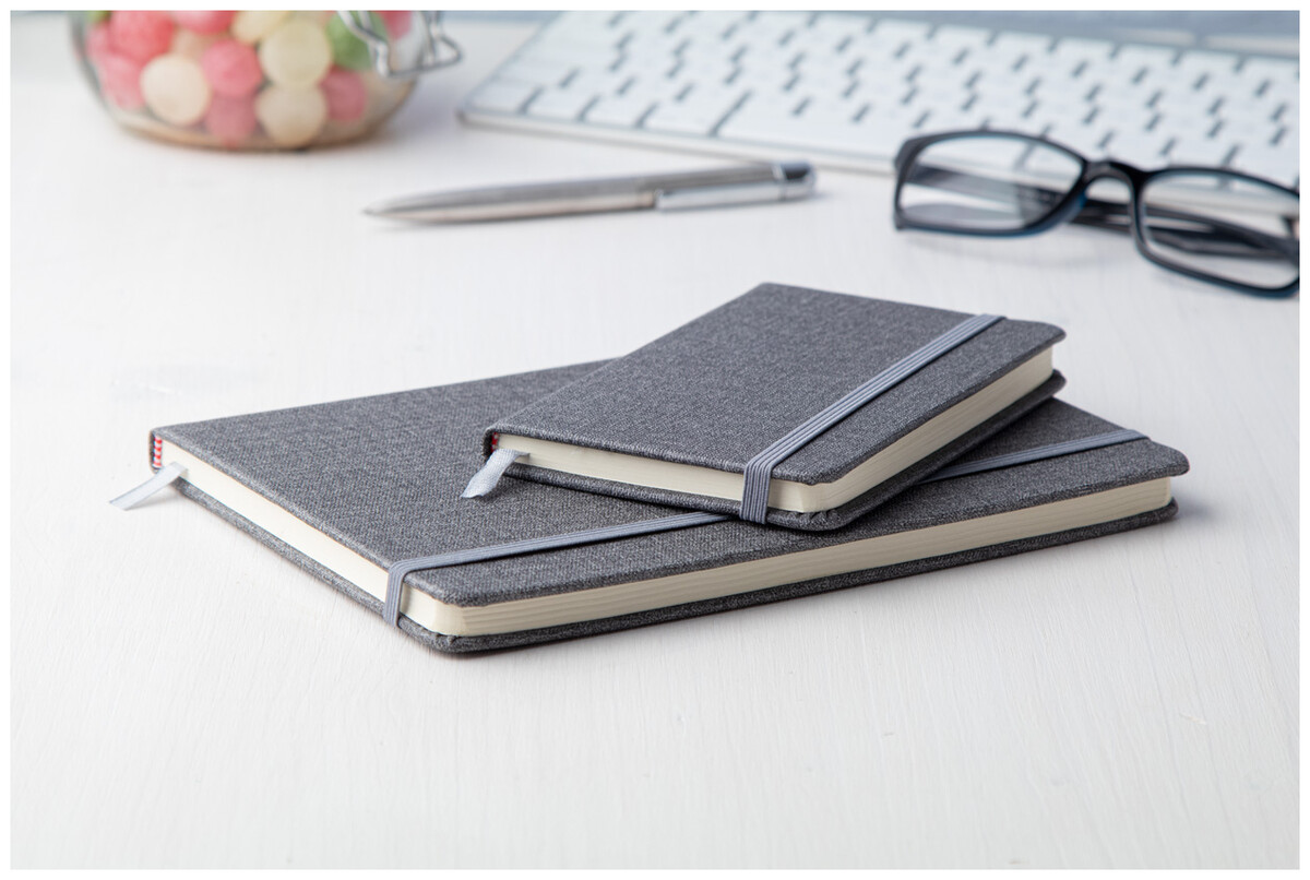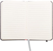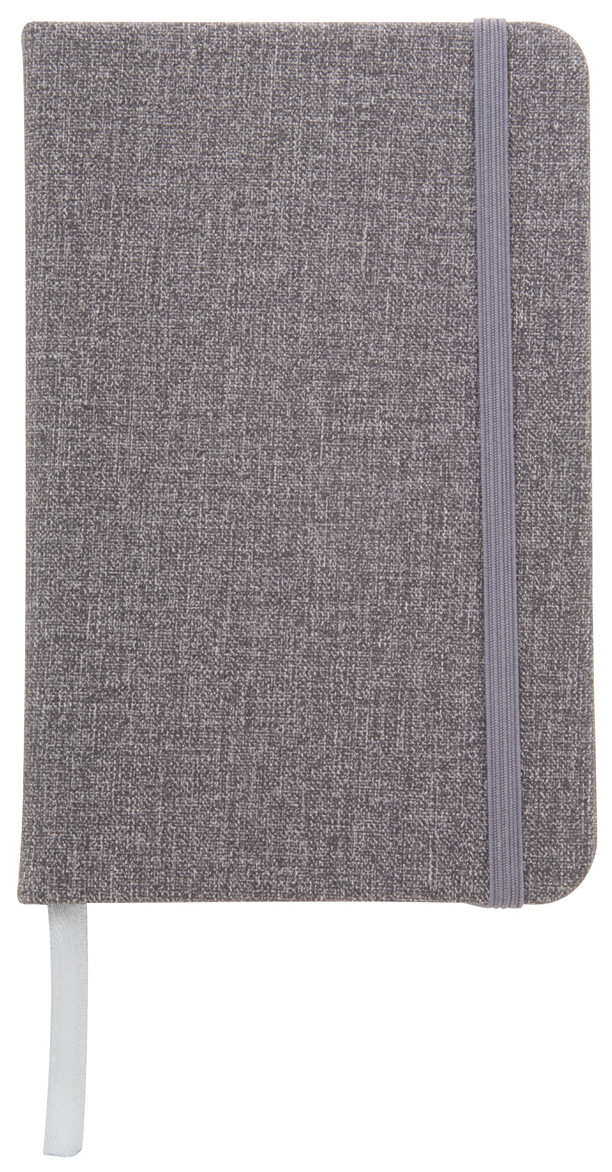 Blok A6 s deskami ze strukturované PU kůže, s gumičkou a 80 listým linkovaným blokem.