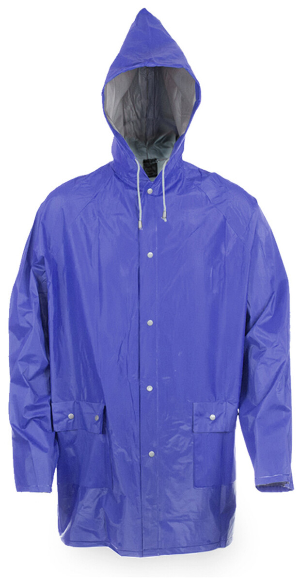 Pláštěnka s kapucí z odolného PVC s žáruvzdornou povrchovou úpravou. Se zapínáním na knoflíky a dvěma předními kapsami.