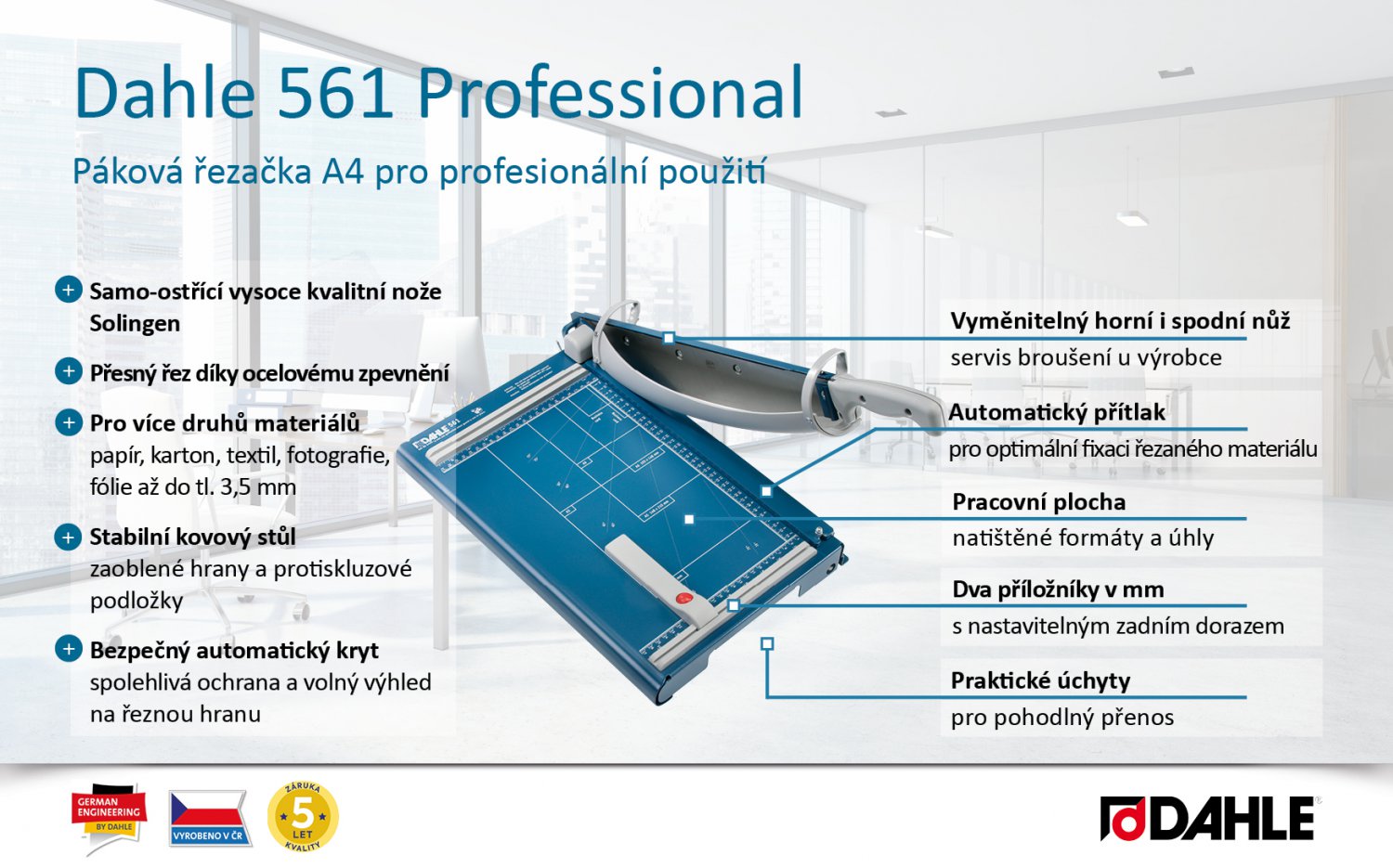 Profesionální páková řezačka pro každodenní použití. Samo-ostřící vysoce kvalitní nože Solingen pro stálou kvalitu řezu. Ocelové zpevnění hřbetu nože zaručuje stabilitu a přesnost řezu. Určeno pro více druhů materiálů: papír, karton, textil, fotografie a fólie. Vyměnitelný, brousitelný horní i spodní nůž. Stabilní kovový stůl s neklouzavými pryžovými podložkami pro komfortní provoz. Bezpečný automatický kryt poskytuje spolehlivou ochranu a volný výhled na řeznou hranu. Natištěné úhly a DIN formáty usnadňují přesné vyrovnání řezaného materiálu. Dva příložníky s dělením v mm a nastavitelným zadním dorazem pro fixaci řezaného materiálu a přesný řez 90°. Automatický přítlak pro optimální fixaci řezaného materiálu. Praktické úchyty pro přenos. Ergonomicky tvarovaná rukojeť zajistí pohodlné řezání.