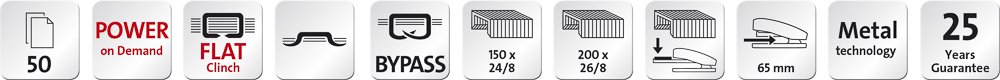 Sešívačka má celokovovou konstrukci s plastovým opláštěním, výklopnou páku pro úsporu místa, hmotnost 680 g a prodlouženou záruku 25 let.