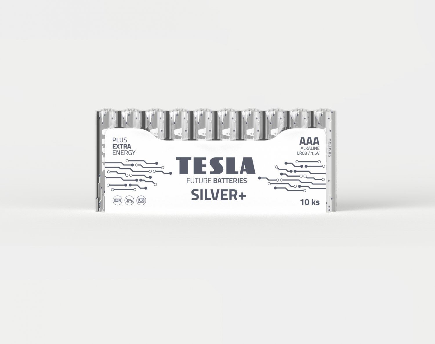 Řada baterií TESLA SILVER+ zahrnuje alkalické baterie typu AAA určené pro přístroje s dlouhodobým vysokým odběrem elektrické energie. Představuje ideální volbu pro elektronické hračky. Tuto řadu specifikuje dlouhotrvající výdrž baterie při stálém energetickém zatížení.