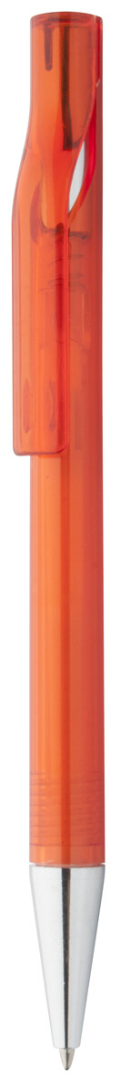 Plastové transparentní barevné kuličkové pero s chromovou špičkou a modrou náplní.