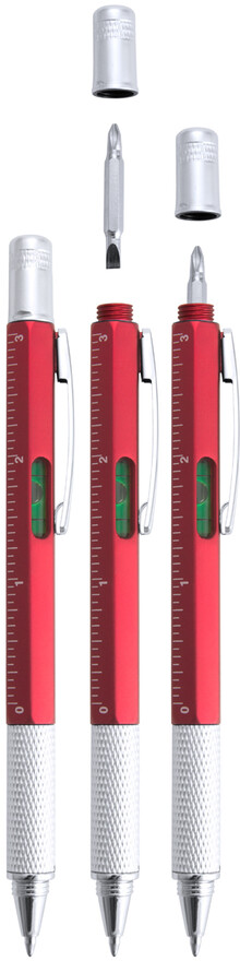 Plastové kuličkové pero s plochými a hvězdicovými šroubováky, vodováhou a pravítkem 7 cm / 3 palce. S kovovým klipem a modrou náplní.