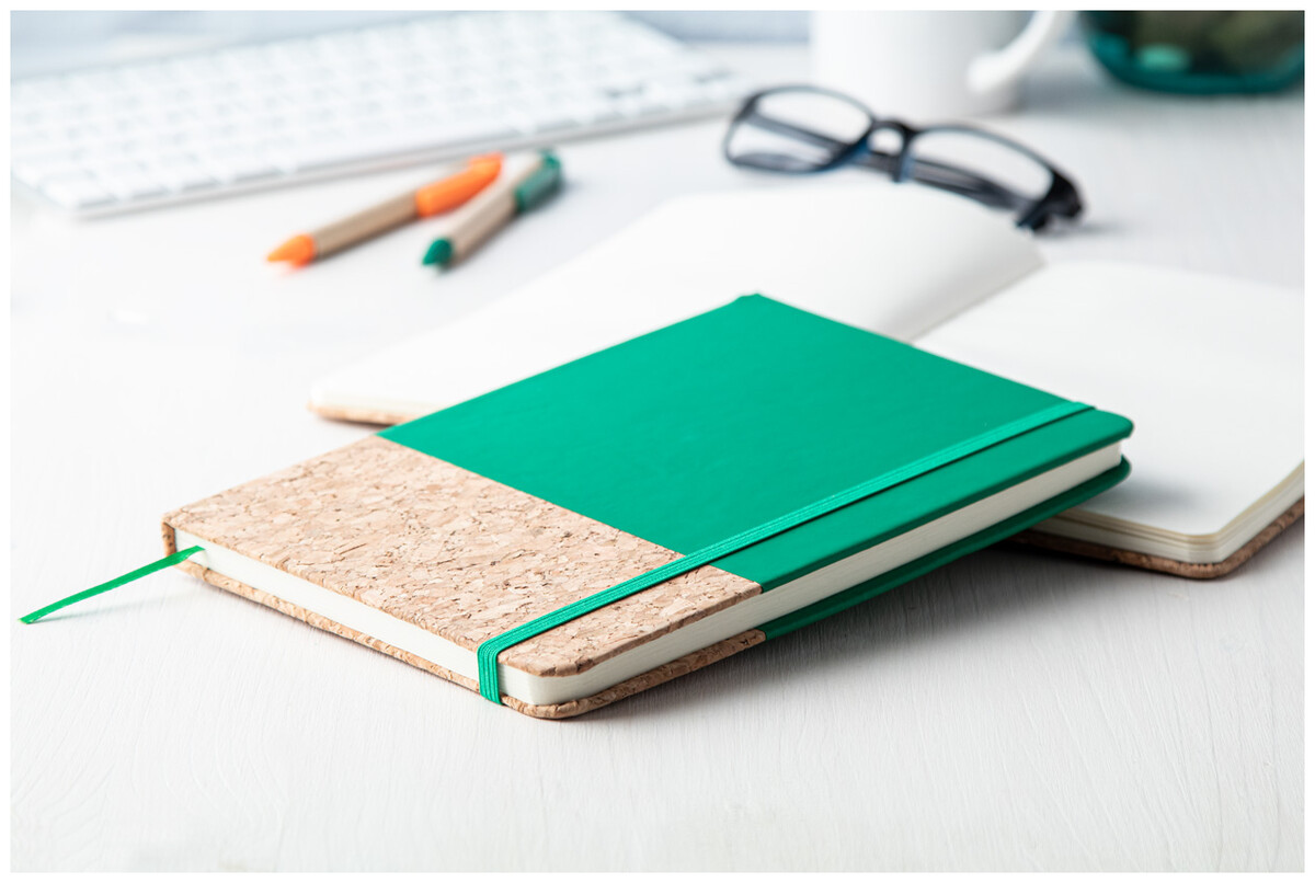 Blok A5 s deskami z přírodního korku a PU kůže, s gumičkou a 98 čistými listy.