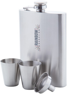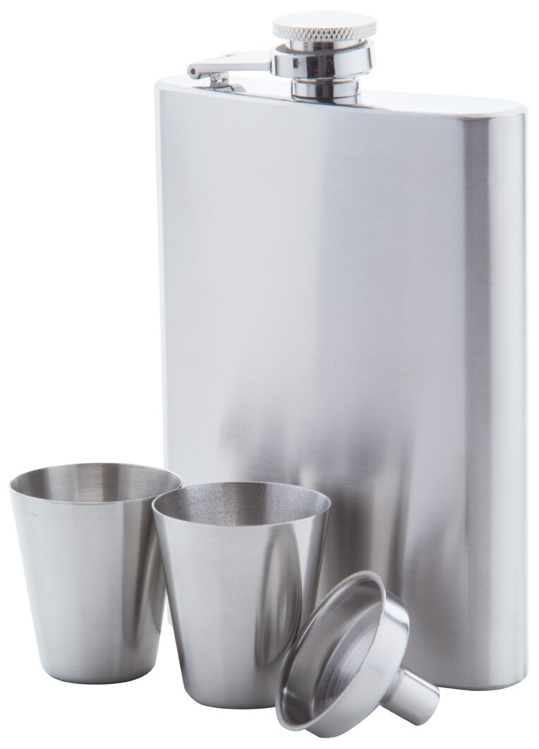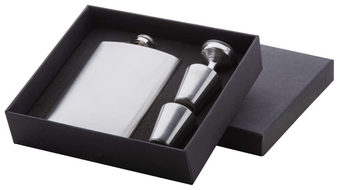Butylka z nerez oceli se 2 kalíšky a nálevkou, 230 ml. V černé dárkové krabičce.